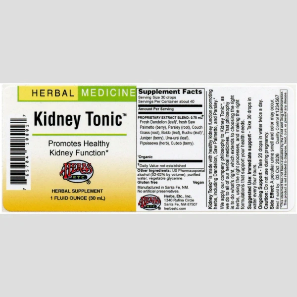 Kidney Tonic™ Promotes healthy kidney function and, when used over a period of time, strengthens the urinary system. Useful for lower back pain, water retention in PMS or from changes in heat or humidity. Use when challenges or irritation of the kidneys, ureters, bladder and urethra occur. Useful for the tendency to urinate excessively at night.